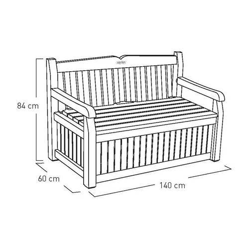 Banco y arcón de ordenación exterior imitación madera. Fabricado con un 60% de material reciclado. Fácil montaje mediante sistema click. Refuerzos metálicos en zona asiento. Baúl con capacidad de 265L.
