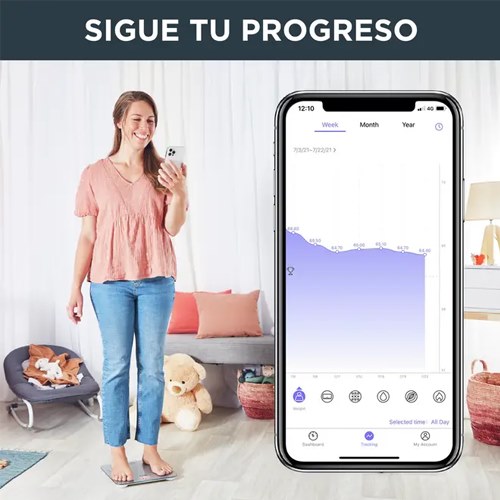 * Visualiza facilmente tu progreso gracias a una aplicación gratuita y sencilla conectada a la báscula.