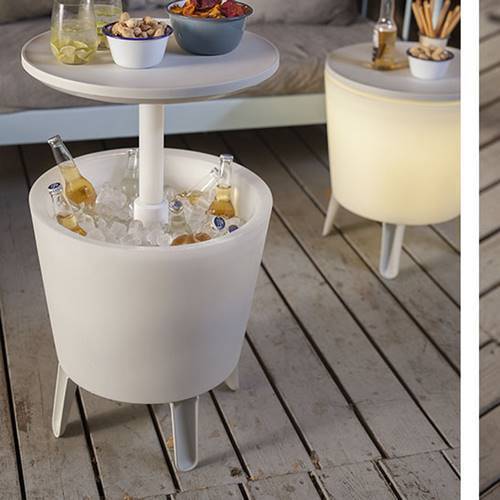 * Mueble de exterior multipropósito, que sirve como mesa de cócteles, mesa de centro y nevera, todo en uno.